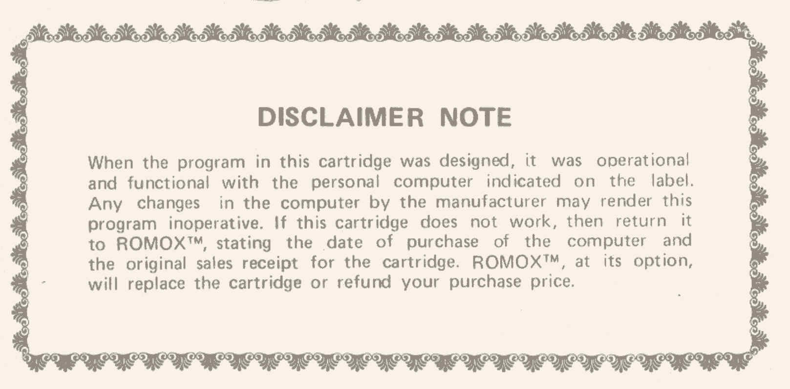 Note This Disclaimer Note came in most (if not all) TI-99/4A cartridge packages, and probably other systems as well. It basically states that the cartridge was tested and works on the system it was designed for, but if a console manufacturer has altered its hardware design in such a way that the cartridge cannot be used anymore Romox will replace the cartridge or refund your money. |